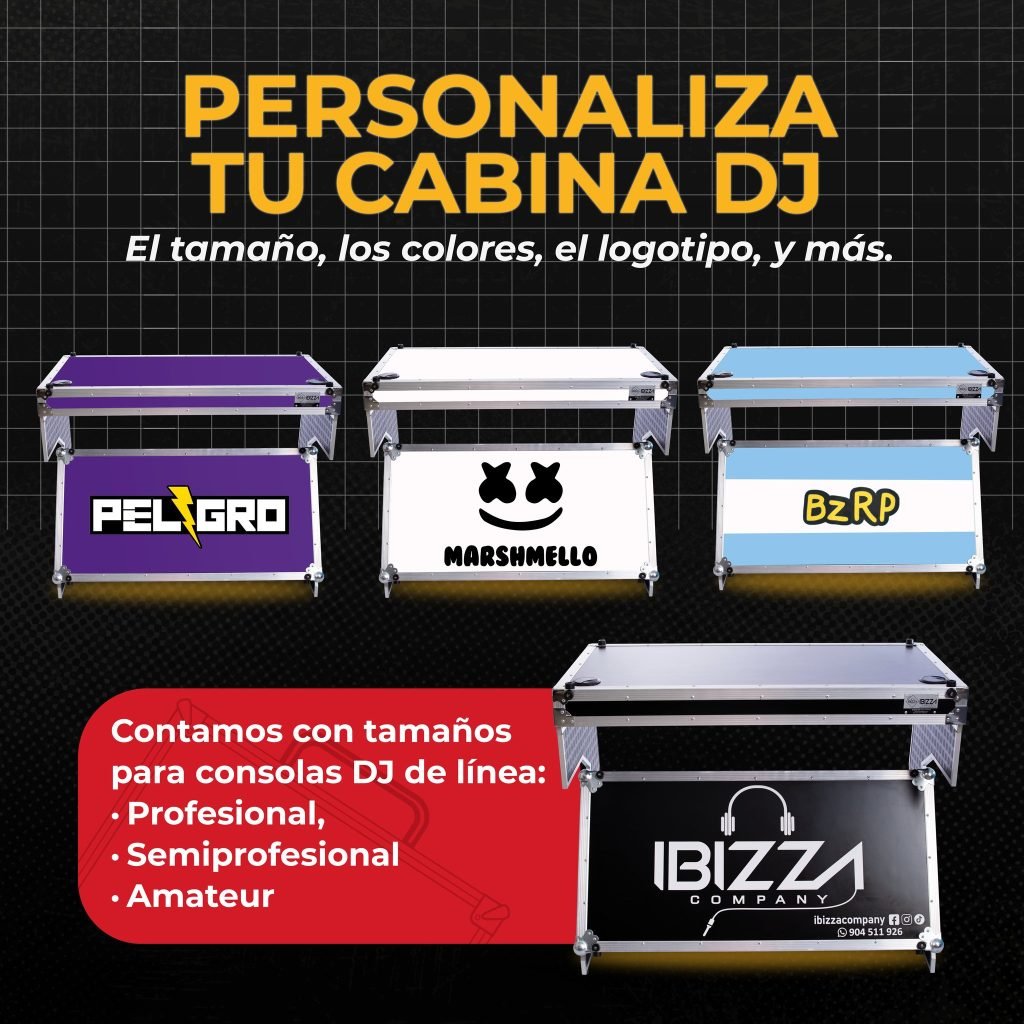Las Cabina para DJ Z PRO de Ibizza Company están diseñadas para artistas que buscan estilo, comodidad y resistencia. Hechas con materiales resistentes y acabados elegantes, son ideales para eventos, clubes y sets en vivo. ¡Lleva tu marca al siguiente nivel!